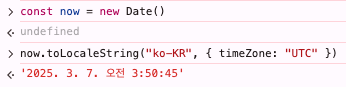 그럼 실무에서 UTC 시간대를 기준으로 날짜/시간을 알고 싶다고 했을 때 new Date().toISOString()을 한 다음 split이나 slice 등을 활용해서 포맷을 직접 해야하는걸까...?라는 생각이 들 것 같다. 자바스크립트 강의에서도 split을 사용하는 방법이 나왔는데, 사실 이렇게 되면 형식이 바뀐다고 했을 때, 혹은 포맷팅 하는 메서드가 잘못될 가능성 등이 있기 때문에 조심스럽게 써야 한다.