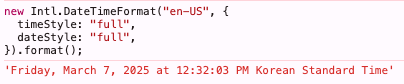 첫 번째 파라미터에는 날짜를 표시하고자 하는 언어를 표시한다. 그리고 두번째 파라미터에는 options를 넣어 포맷하고자 하는 정보를 구체적으로 넣을 수 있다. 예를 들어 timeStyle, dateStyle 등을 통해 short, medium, full 등을 입력하면 아래 이미지처럼 결과가 다르게 나타난다.