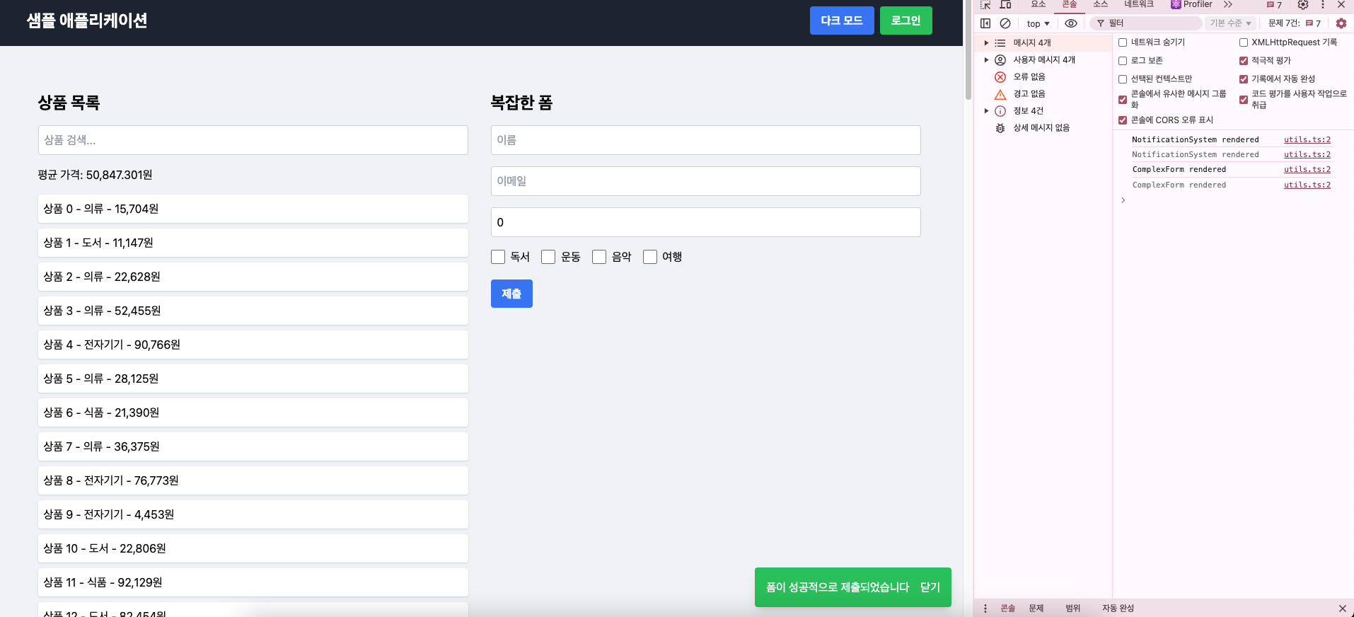 - 샘플 애플리케이션 최적화 진행 (직접 구현한 훅 활용, 하나로 합쳐져 있는 Context 분리)