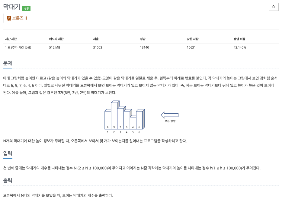 - 바라보는 관점에서는 무조건 앞 순서보다 길이가 긴 막대기만 보일 것이기 때문에 이를 기준으로 로직을 구현했다.